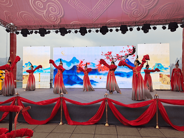 午宴及下午时段,活动精彩纷呈。舞蹈《龙腾盛世》《红袖霓裳羽衣舞》、歌曲《江山无限》、汉服走秀《中国红》等节目轮番上演,传统文化与现代艺术碰撞交融;《爻爻看·好运来》红包互动、“百业同影·万象更新”商家星光大道等环节,让现场嘉宾沉浸式参与,尽显热闹氛围;品美食、写春联、领福袋、偶遇趣味NPC等互动体验,更让爻里小镇的文化底蕴与烟火气息深入人心。