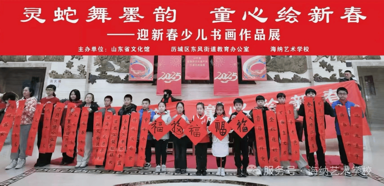 2025年春节前夕,王昭海率全体学员参加了在省文化馆举办的“灵蛇舞墨韵”迎新春少儿书法展,30名少儿在文化馆大厅挥毫泼墨,各显身手,一幅幅春联似红梅绽放,一张张“福”字笑逐颜开。当五位小朋友高举“福”字,向全省人民同声祝贺“新春快乐、五福临门”时,大厅里爆发出雷呜般的掌声!王昭海面对眼前的场景,犹如老农看到了满坡丰收在望的庄稼!心潮澎湃,喜上眉梢。看到孩子们越来越工整的字迹,望着他们眼里越来越亮的光,王昭海深有感触地说:“这就是我最大的收获,比任何荣誉、任何财富都珍贵!”