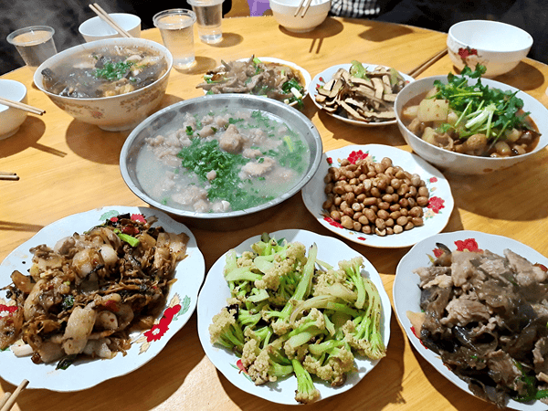 中午时分,新鲜的血旺、嫩滑的猪肝、喷香的回锅肉等食材轮番下锅,搭配着丰盛的农家菜肴,一碗碗热气腾腾的刨猪汤被端上餐桌。鲜香扑鼻间,宗亲们围坐举筷、开怀共品,畅谈声与欢笑声交织在一起,满是温情。