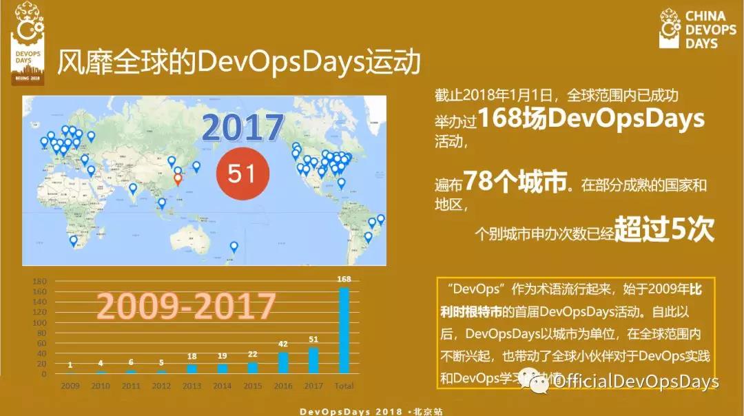 DevOpsDays是由”DevOps”一词的提出者,被誉为“DevOps之父“的Patrick Debois先生在2009年比利时根特市发起的。随即成为风靡全球的DevOps实践交流和分享盛会,截止2018年1月1日,全球已累计举办了168场DevOpsDays活动。DevOpsDays以城市为单位进行申办,举办地以欧美城市为代表,目前已覆盖全球80多个城市,部分先锋城市已经举办超过6届活动。DevOpsDays是目前全球范围内交流DevOps实践、分享经验的最权威的品牌活动。